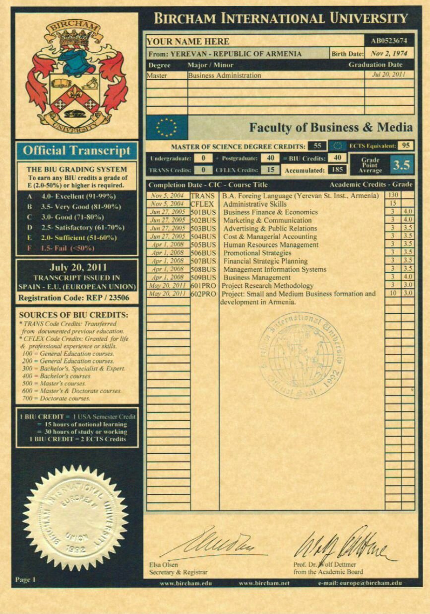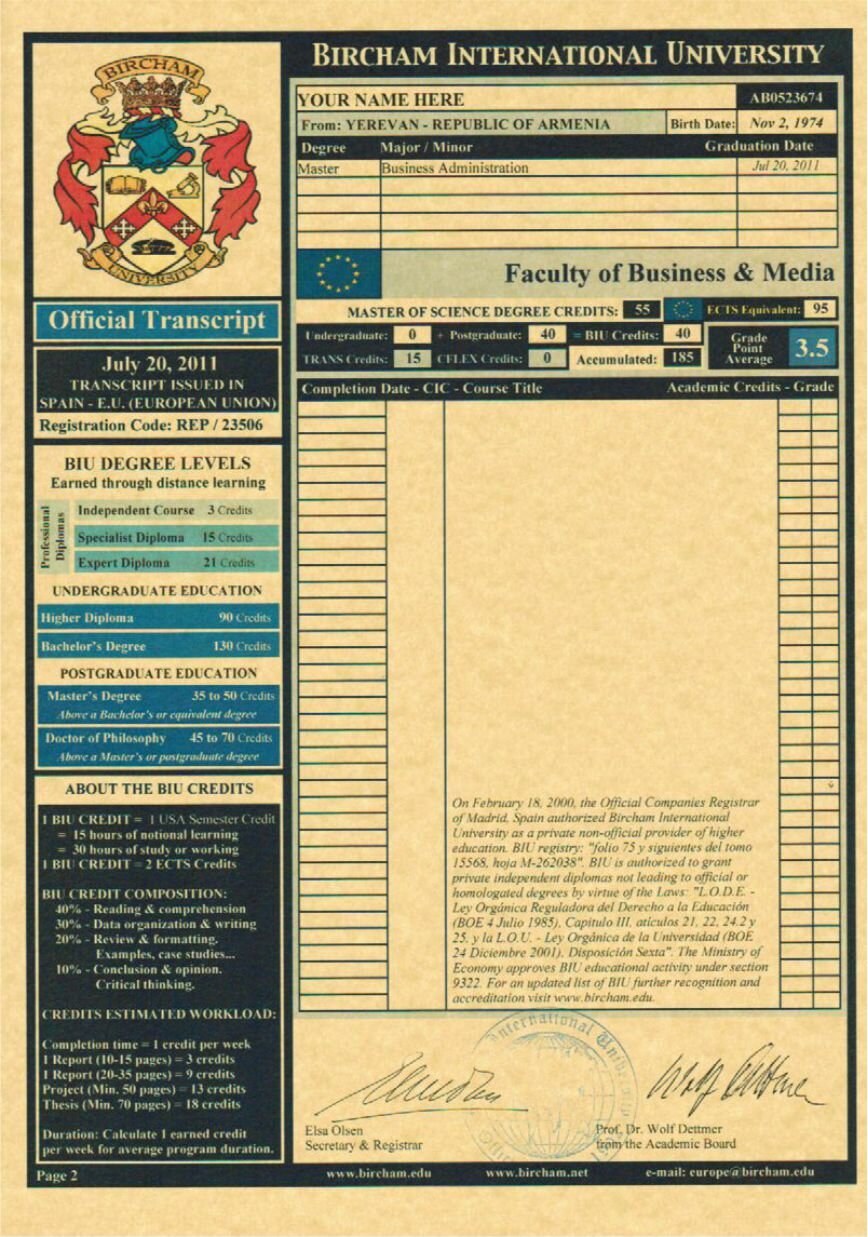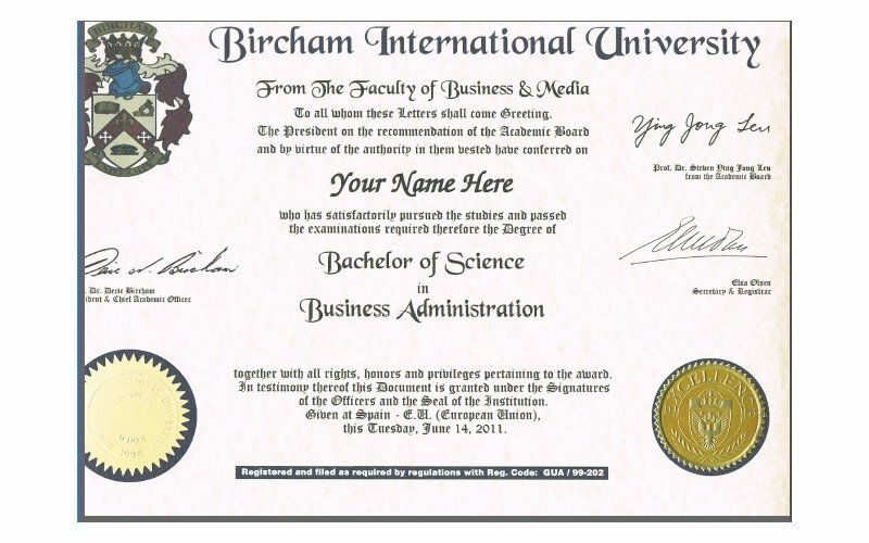 - Bachelor of Business Administration por Bircham International University. (BIU) - Opcional.