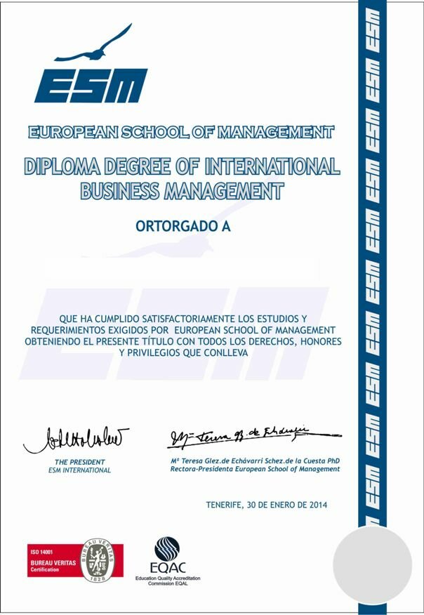 - Diploma Internacional Europeo Privado en Dirección y Administración de Empresas ESM.